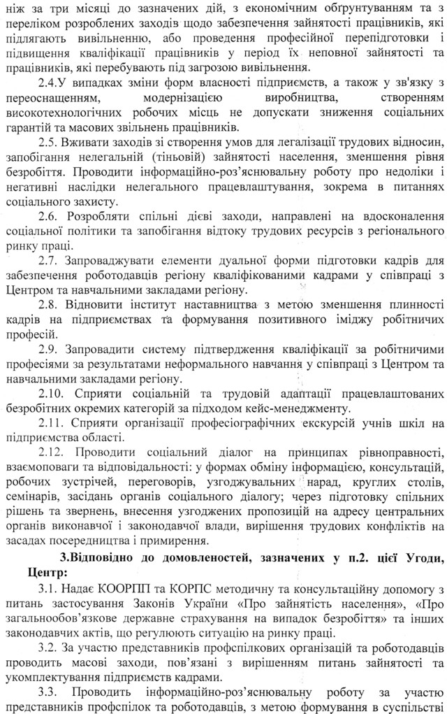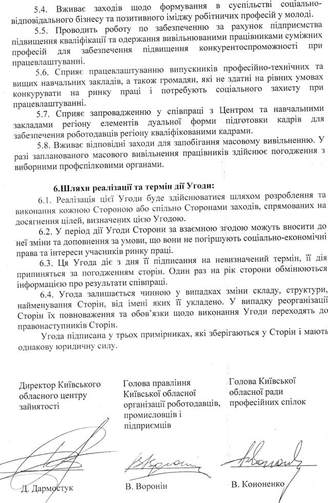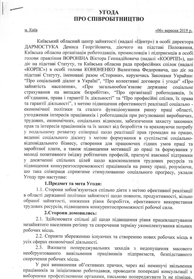 Ç ìåòîþ ï³äâèùåííÿ åôåêòèâíîñò³ ðåàë³çàö³¿ ñîö³àëüíî-åêîíîì³÷íî¿ ïîë³òèêè òà ñòàëîãî ôóíêö³îíóâàííÿ ðèíêó ïðàö³ Êè¿âùèíè , óçãîäæåííÿ ³íòåðåñ³â ïðàö³âíèê³â ³ ðîáîòîäàâö³â ïðè ðåãóëþâàíí³ âèðîáíè÷èõ, òðóäîâèõ, åêîíîì³÷íèõ òà ñîö³àëüíèõ â³äíîñèí, çàáåçïå÷åííÿ çàõèñòó ïðàö³âíèê³â â³ä áåçðîá³òòÿ òà ïðàãíó÷è âçàºìíî¿ ï³äòðèìêè ó äîñÿãíåíí³ ñï³ëüíèõ ö³ëåé ùîäî âäîñêîíàëåííÿ òðóäîâèõ ðåñóðñ³â òà ï³äâèùåííÿ êîíêóðåíòîñïðîìîæíîñò³ ïðàö³âíèê³â íà ðèíêó ïðàö³, 06 âåðåñíÿ 2019 ðîêó ï³äïèñàíî Óãîäó ïðî ñï³âðîá³òíèöòâî ì³æ Êè¿âñüêèì îáëàñíèì öåíòðîì çàéíÿòîñò³, Êè¿âñüêîþ îáëàñíîþ îðãàí³çàö³ºþ ðîáîòîäàâö³â, ïðîìèñëîâö³â ³ ï³äïðèºìö³â òà Êè¿âñüêîþ îáëàñíîþ ðàäîþ ïðîôåñ³éíèõ ñï³ëîê.